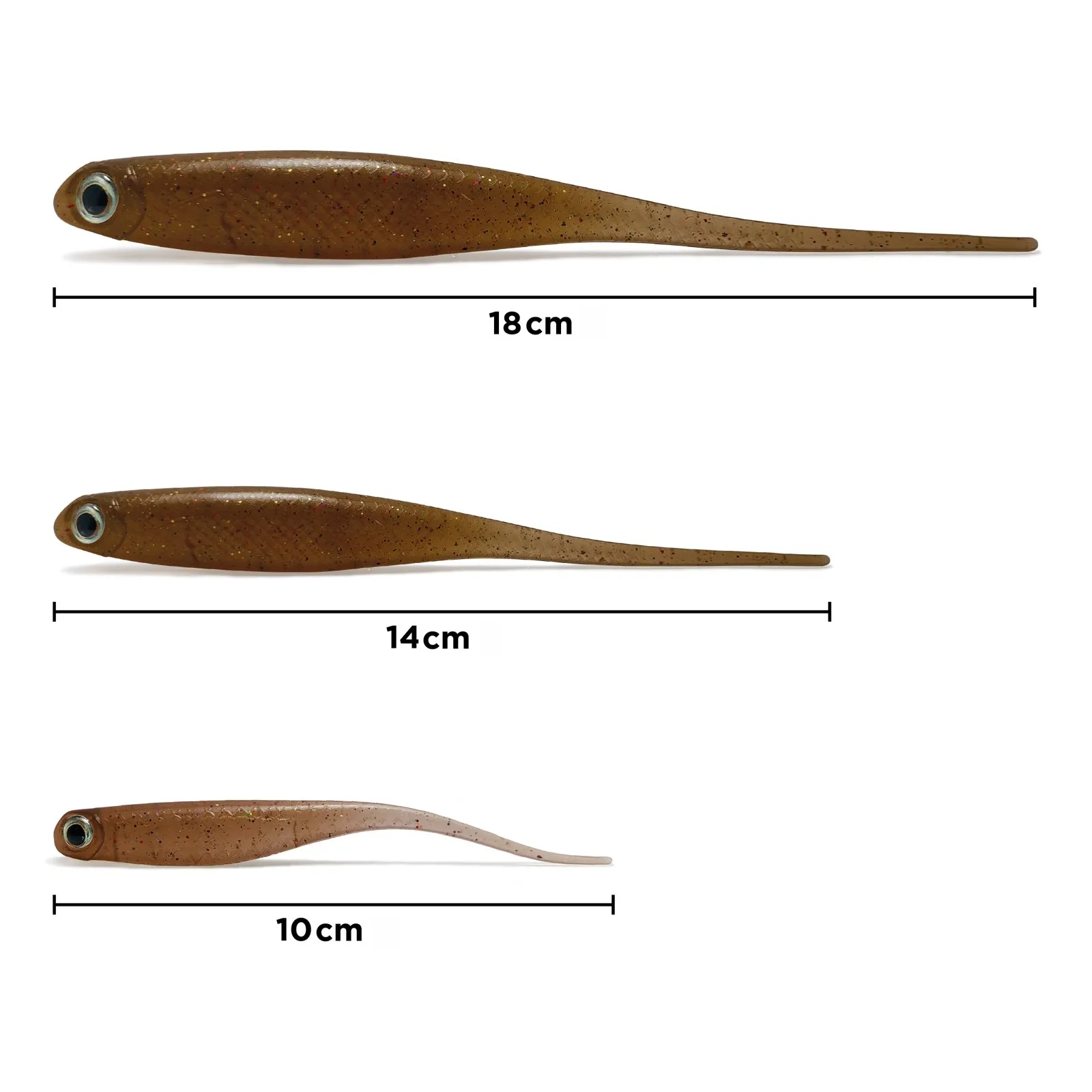 Versátil por natureza, a Minnow 14cm permite diversas montagens: jig head, offset, sistema Texas ou Carolina. Sua estrutura alongada com cauda móvel oferece um nado vibrante e realista, chamando atenção mesmo em águas turvas ou sob pressão de pesca.
